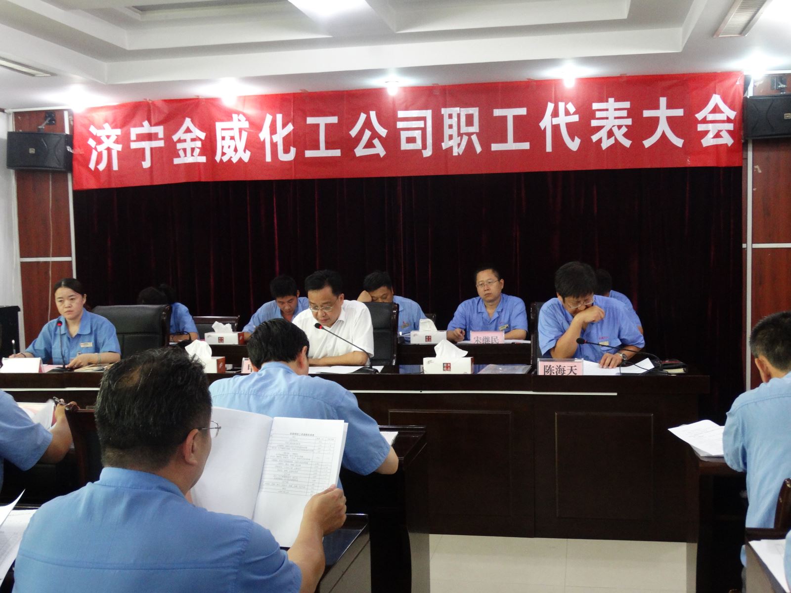 8月4日,金威化工公司在三楼会议室召开职工代表大会,主要目的是听取并审议《济宁金威化工公司岗位绩效工资制实施方案》,统一工资标准,进一步理顺薪酬分配关系,激发全员工作积极性,提高劳动效率,促进公司持续稳定健康发展。工会主席吴艳蕊主持会议,应到职工代表57人,实到54人,符合法定程序。